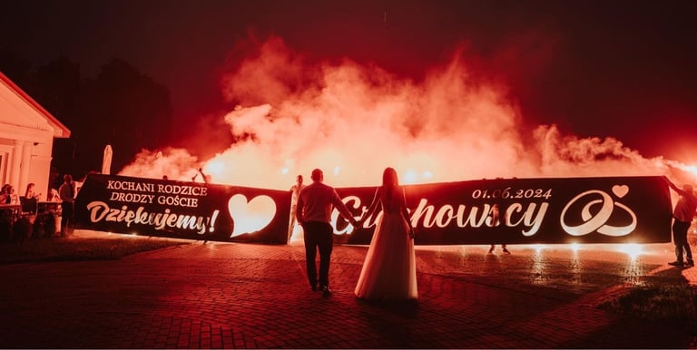 Jednym z najchętniej wybieranych rozwiązań jest baner weselny z napisem pirotechnicznym, który łączy estetykę, symbolikę i efekt wizualny.