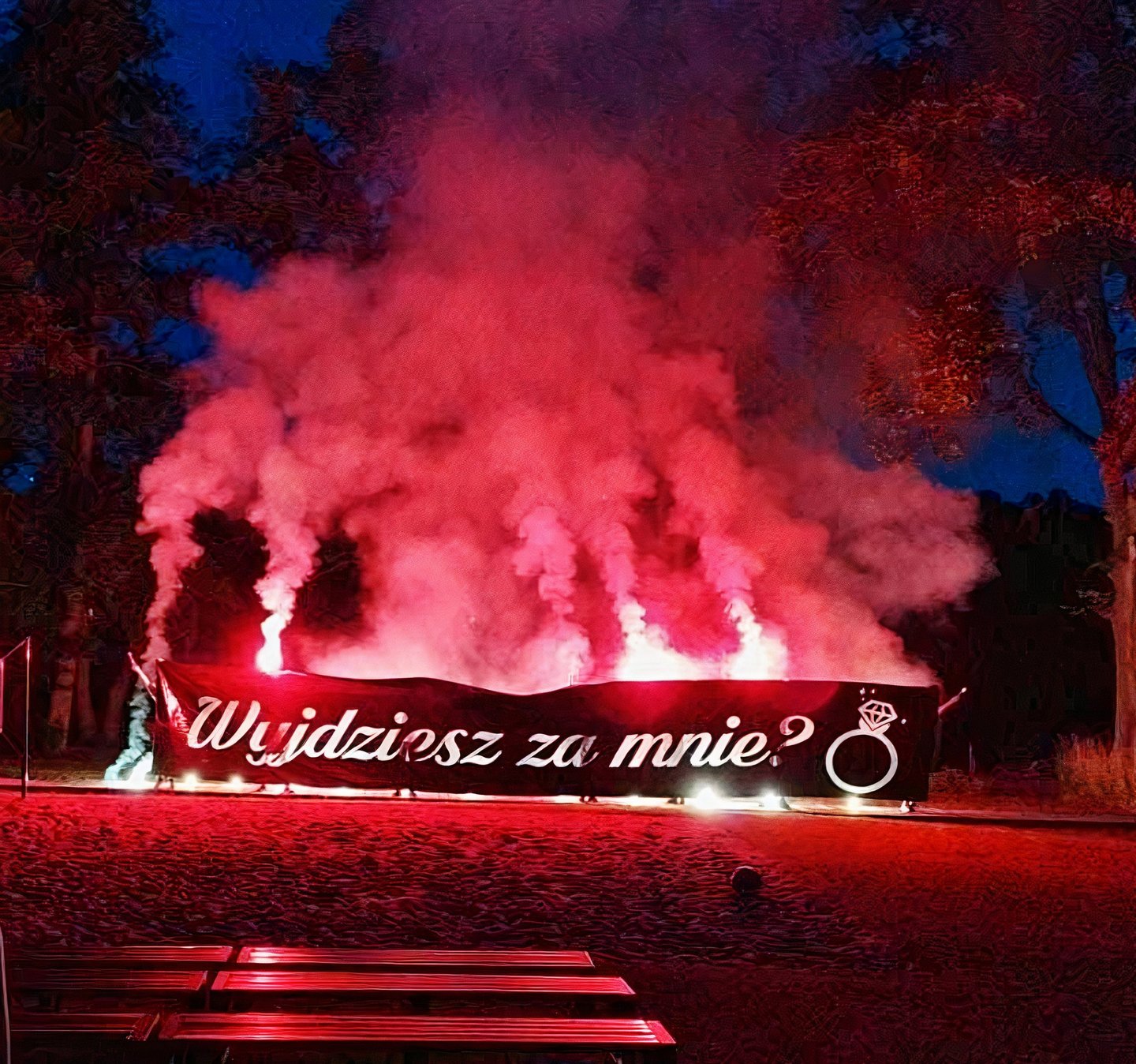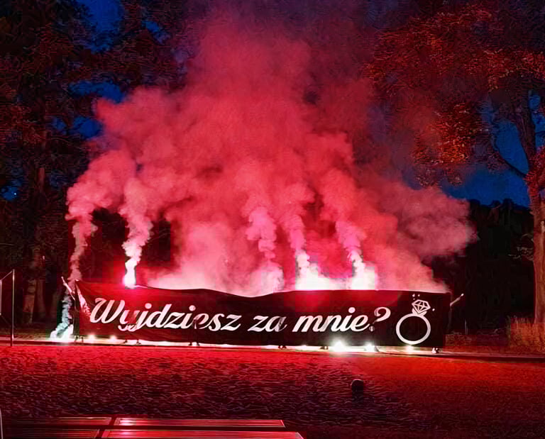 Jednym z takich rozwiązań są zaręczyny z pirotechniką — wyjątkowa forma oprawy, w której rozświetlony napis staje się centralnym punktem całej chwili. To nie jest zwykła dekoracja. To moment z efektem WOW — pełen światła, emocji i wzruszeń, który tworzy idealne tło dla tego jednego, najważniejszego pytania.