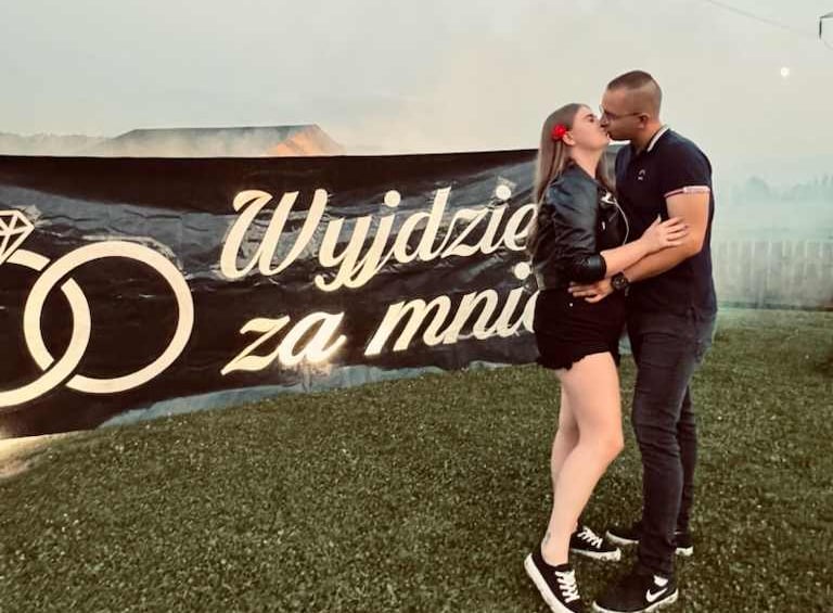 Baner z napisem „Wyjdziesz za mnie?” tworzy idealne tło dla tej chwili.